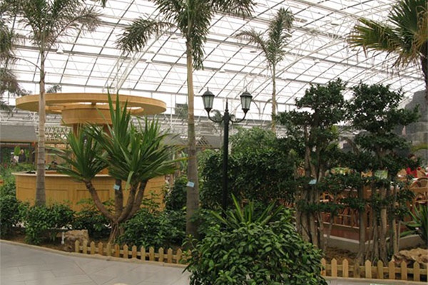 文洛式玻璃溫室為一跨三尖頂、雙坡面小屋頂桁架結(jié)構(gòu)、多雨槽、具有美觀、吊掛能力強(qiáng)、透光性好、空間大、機(jī)械性能強(qiáng)等優(yōu)點(diǎn)。