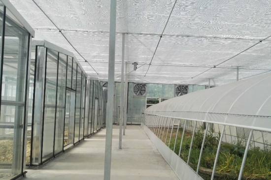 連棟薄膜溫室配備外遮陽系統(tǒng),內(nèi)遮陽系統(tǒng),棚內(nèi)有小的玻璃溫室,單體大棚,風(fēng)機(jī)濕簾降溫系統(tǒng),水培系統(tǒng),智能控制系統(tǒng)!